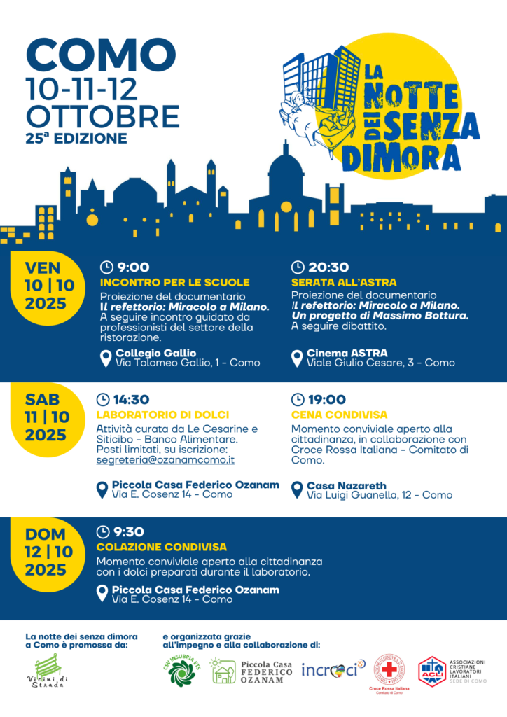 Il 10, 11 e 12 ottobre anche Como organizza “La notte dei senza dimora”, iniziativa nazionale di sensibilizzazione sul tema della povertà estrema e dell’emarginazione sociale, giunta alla sua 25^ edizione.